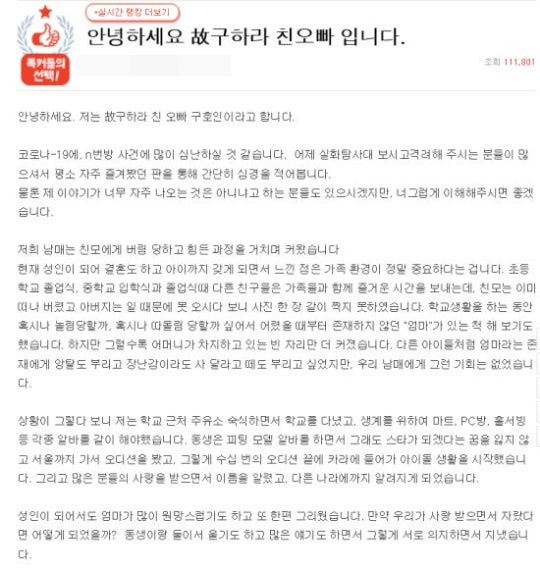 He left a lengthy message on an online community on the 2nd and wrote, "My sister and I were abandoned by our mother and had a difficult life growing up. We even pretended to have a mother who didn't exist just so we wouldn't get bullied or teased in school. Even as an adult, I resent her a lot because of that but still miss her. It's because of this that Goo Hara tried to commit suicide many times. Whenever she tried to commit suicide, I would leave my job and come to Seoul to take of her. With the help of the agency I was able to take her to a hospital with tight security and made sure to contact her often. I remember the first time I heard she tried to take her own life I was so upset, I went crazy when I heard the news.